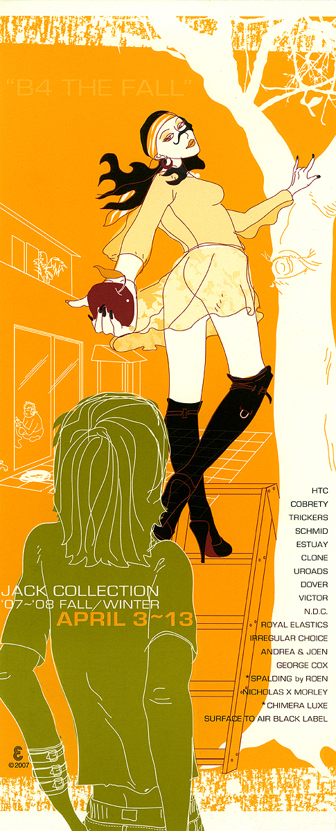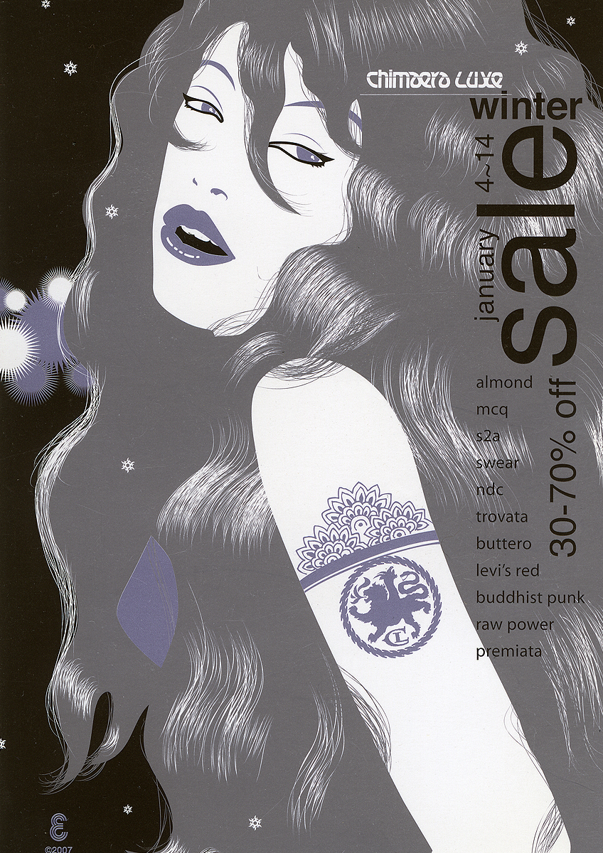 一本の線が無数の点からなるように、無数の線でできています。太かったり、細かったり、このスタイルの基礎に充ち満ちているのは、すべてが線。高性能のコンピュータ、そして鉛筆のように使われるマウスが、ハードエッジなピクトグラムも、柔らかく流れるように女性的なフォルムも創り出します。